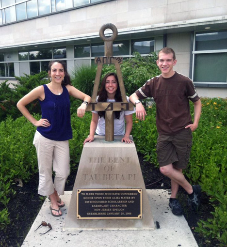 Former president of the NJ Epsilon Chapter of Tau Beta Pi, Brighid K. Burgin (NJ E 2012), recently uploaded an image of herself and two other Tau Bates in front of the Bent monument on the Rowan University campus. See the image below with Burgin on the left; center Jaclyn M. Navara (NJ E 2013) most recent chapter president; and far right Christopher J. Cullen (NJ E 2014) current chapter president.