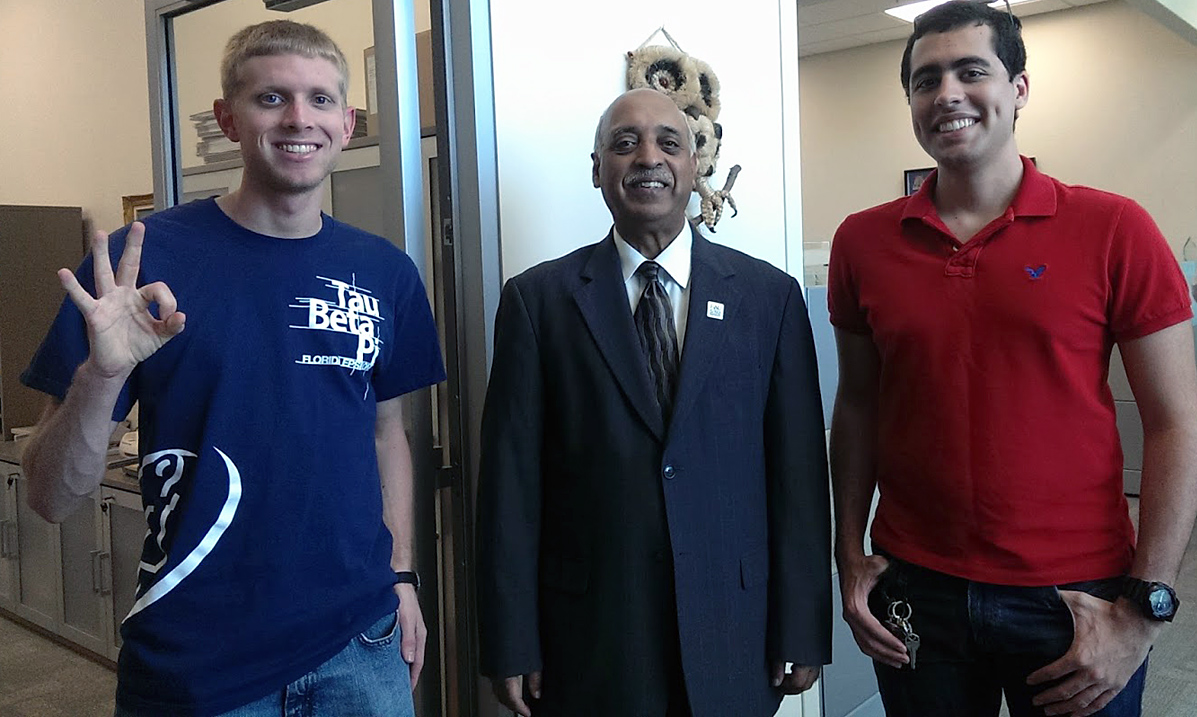 The FL Epsilon chapter also hosted several fun activities to celebrate Pi Day 2014, including a scavenger hunt competition where teams had to find a list of items and take pictures. Below is a picture of two FL E collegiate members with FAU Engineering College Dean Mohammad Ilyas, Ph.D., P.E. (FL E ’76):
