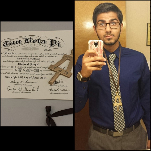 Shahrukh Bengali, FL B 2016, is a junior majoring in biomedical engineering at the University of Miami (FL). He was initiated this past weekend at the Florida Beta Chapter of Tau Beta Pi. Here is his Tau Beta Pi selfie, which includes his membership certificate and him wearing his shined flat bent casting.