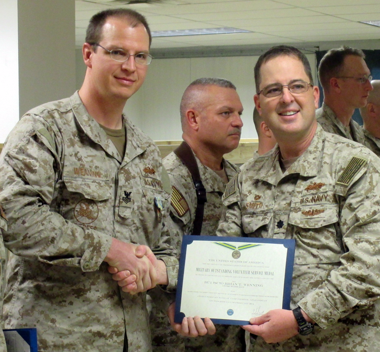 BU1(SCW/SS) Brian Wenning, OH G ’02, was awarded the Military Outstanding Volunteer Service Medal (MOVSM) in 2014. He was stationed in Afghanistan as a member of the Navy Seabees, command was Naval Mobile Construction Battalion 28. In total Wenning has spent 23 years in the U.S. Navy, six in the nuclear navy (submarines), seven in special forces, and ten in Seabees. Currently, is a senior engineer at Bettis Atomic Power Laboratory.