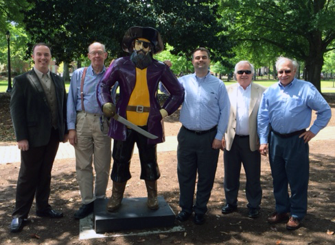 An inspection team of Tau Beta Pi leaders visited East Carolina University (ECU) this week. See the image below of the team with Pee Dee the Pirate, the school’s mascot. From left to right: Michael R. Gustafson II, Ph.D. (NC G ’93), associate professor at Duke University and chief advisor to the NC Gamma Chapter of TBP; Roger E. Hawks, NY L ’75, TBP Assistant Secretary-Treasurer; Joseph P. Blackford, DC G ’95, Presidnt of TBP; Hayden Griffin Jr., Ph.D. (TX B ’70), professor and department chair at ECU; and Russ L. Werneth, MD B ’64, TBP District 4 Director.