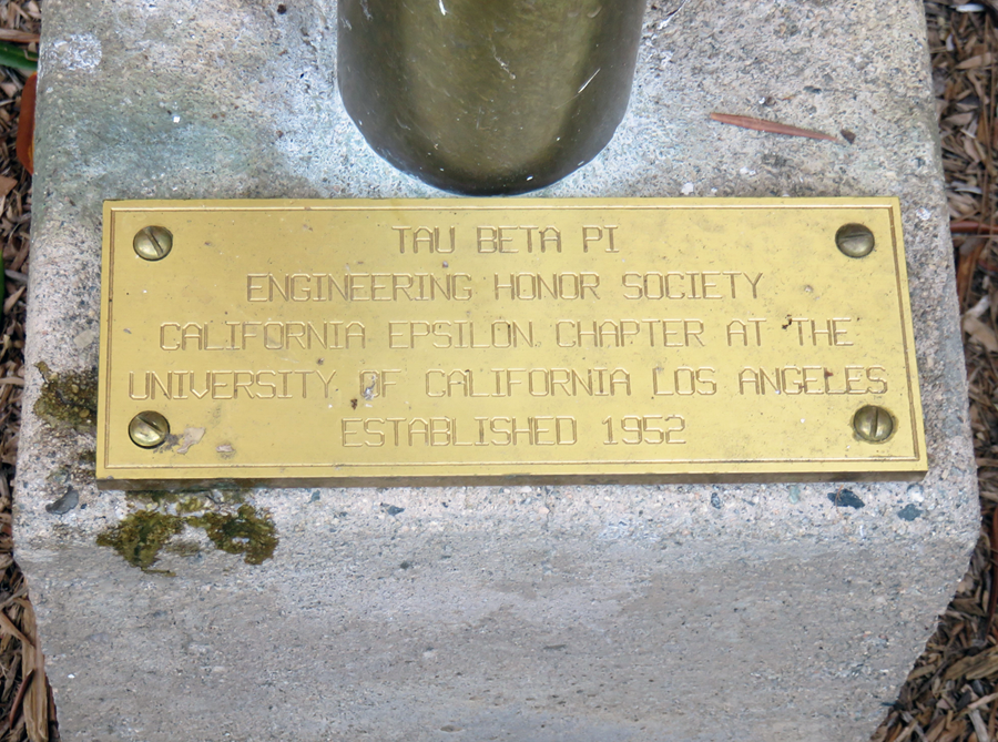 Chief Advisor Bill Goodon, Ph.D. (CA E ’75), of the CA Epsilon Chapter of Tau Beta Pi worked together with the leadership from the Dean’s Office at UCLA to install a plaque on the bent monument on campus. The proud chapter was installed in 1952 (63 years ago) and now those that pass by the bent will be able to quickly learn the key information about the monument.
