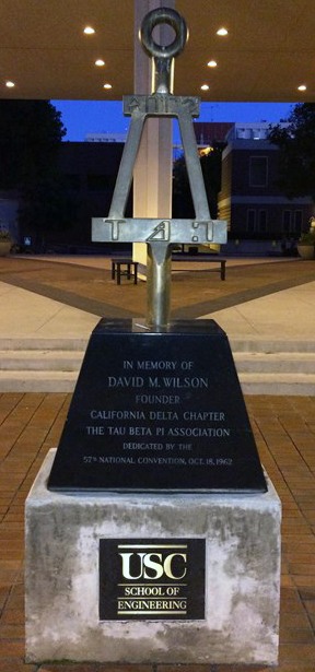 The Bent monument on the campus of the University of Southern California (USC) was profiled on Waymarking.com. The monument is dedicated to David M. Wilson, MI G 1919, as the “founder of the California Delta Chapter of Tau Beta Pi.” It was dedicated by the Association’s 57th Annual Convention on October 18, 1962. See the image below. Wilson was a professor of civil engineering at USC, until his death in 1961.