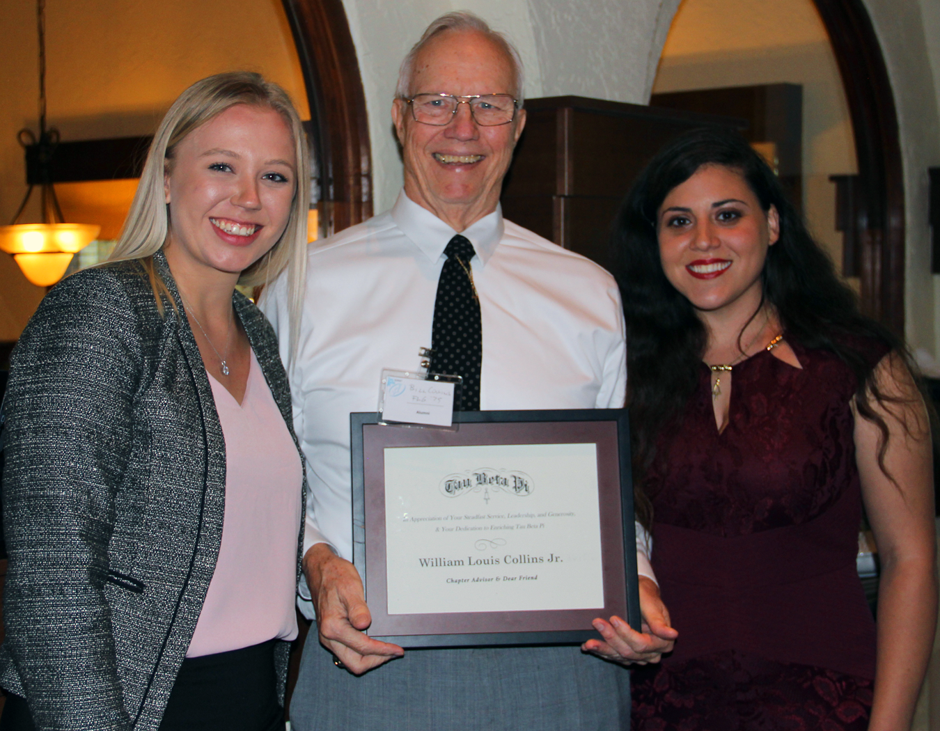 In addition, the chapter recognized departing alumni advisor Bill Collins, FL G ’75, for his service, leadership, and generosity. Collins has served for four year’s as a chapter advisor and was a previous FL Gamma chapter president. See the image above of him receiving a thank you plaque.