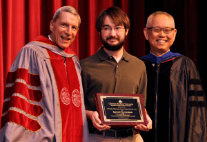 McGinnis served as TN Delta Chapter president and chair of IEEE student chapter. He won 3rd Place in paper competition at the IEEE SoutheastCon 2017. In addition, he was selected as one of the 2016-17 Lasallian Fellows. Trey is in the middle of the picture above receiving his award plaque.