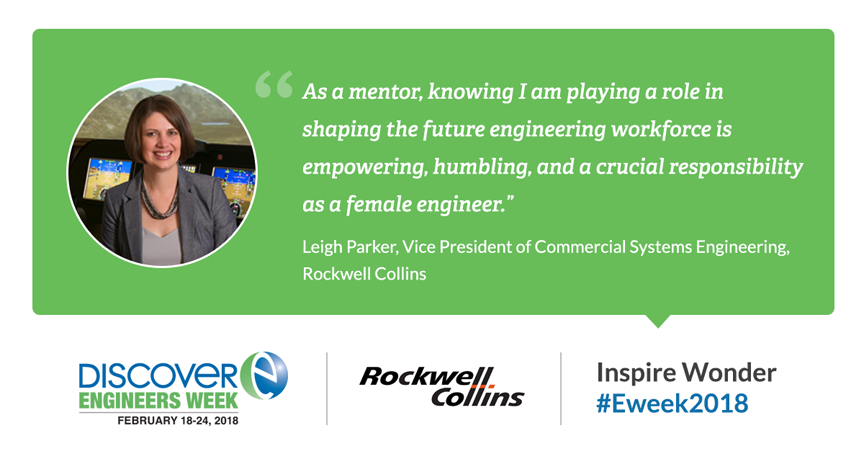 Engineers Week 2018 runs from February 18-24, 2018. On the DiscoverE Facebook page, you can find daily posts on “How will YOU inspire wonder during #Eweek2018?” Yesterday’s quote was from Leigh Parker, KS A ’97, the vice president of engineering at Rockwell Collins. She shared her motivation for volunteering as a mentor in engineering.