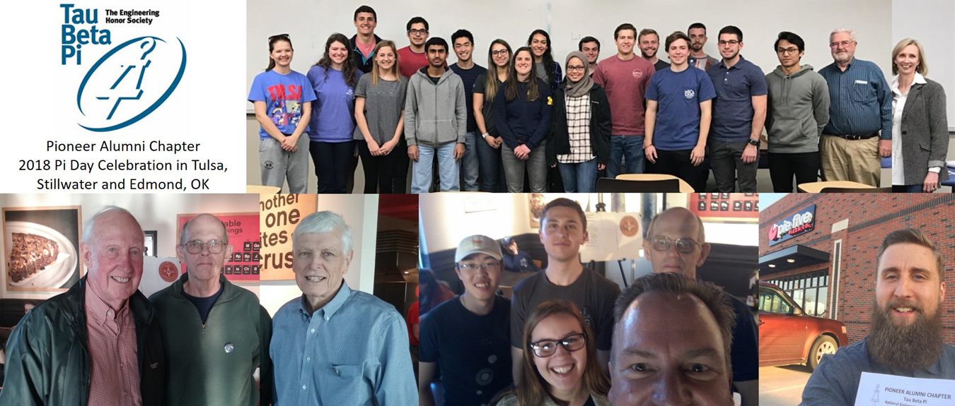 The Pioneer Alumni Chapter of Tau Beta Pi hosted three simultaneous Pi Day events across Oklahoma on March 14. Below (left) is a collage of images from the events. The event in Tulsa was attended by members and students from the University of Tulsa. In addition, the image (right) is from TBP Michigan Gamma’s TBPi Day celebrations. The image was posted to their Instagram account.