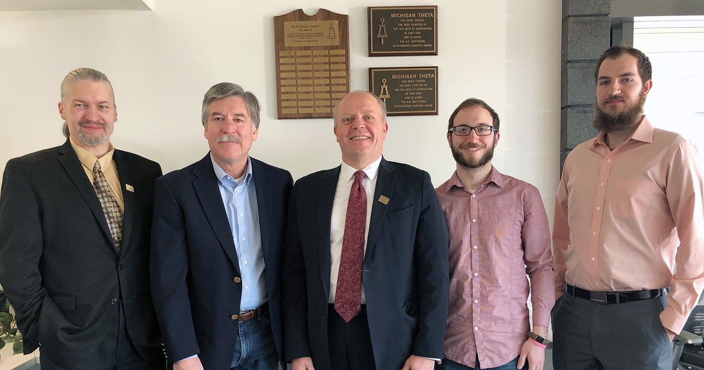 In addition, chief advisor Robert P. Van Til, Ph.D. (MI A ’79), posted an image of the newly mounted R.C. Matthews Outstanding Chapter Award plaques in the Engineering Center. The image includes (center) Dean Louay M. Chamra, Ph.D. (MI Q ’86).