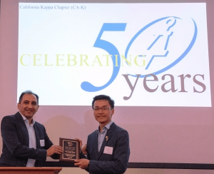 In the picture above, CA Kappa Chapter president Yin F. Khong, CA K 2018, receives a plaque in recognition for his extraordinary dedication and leadership towards the chapter’s growth from Chief Advisor Kourosh Sedghisigarchi, Ph.D. (CA K ’93) CSUN associate professor.