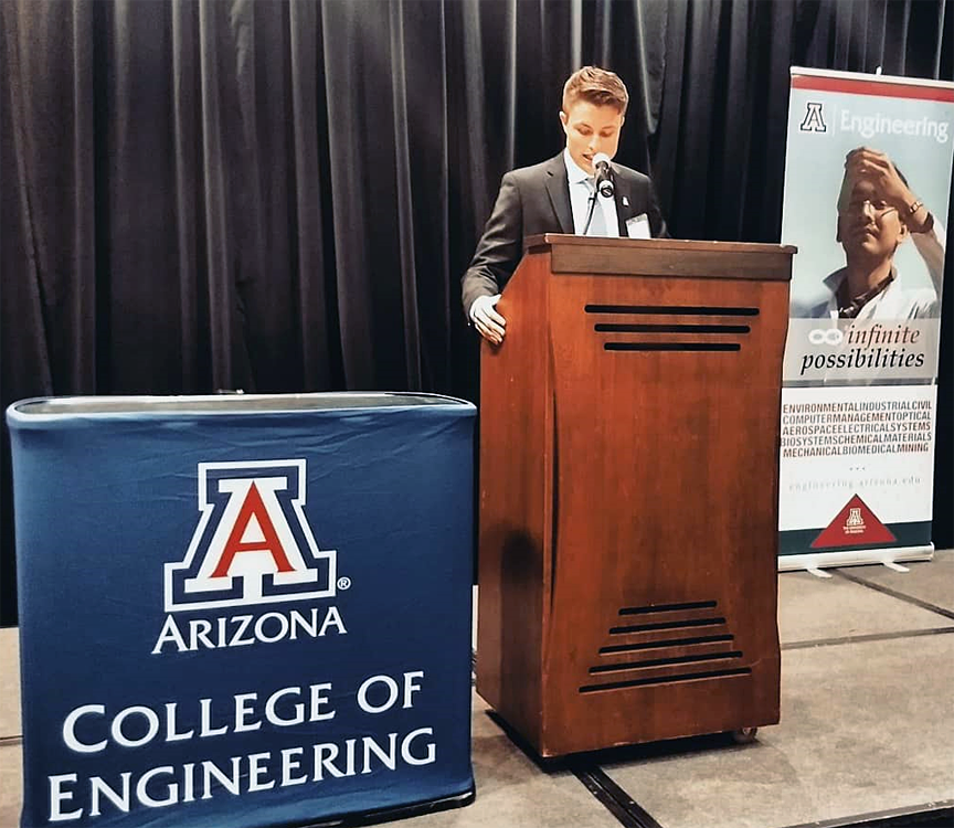 On their Instagram account, the University of Arizona College of Engineering posted the below image of Bailey Bellaire, AZ A 2018, as he provided inspiring remarks during the recent da Vinci Circle annual dinner. Bellaire is a graduating biosystems engineering major and Engineering Ambassador.