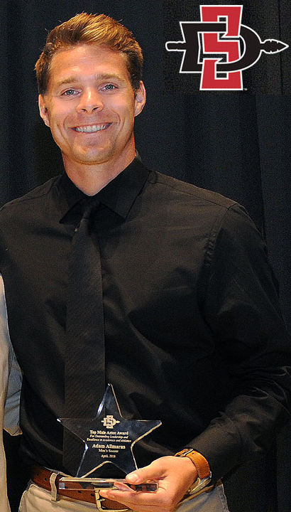 According to the news article, Allmaras was a five-time scholar athlete as a goalkeeper for the men’s soccer team. He received four consecutive All Pac-12 Academic Team honors, All-Region Player honor, and was selected as the 2017-18 SDSU Male Student Athlete of the Year.
