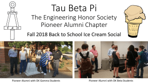 The Pioneer Alumni Chapter also hosted a back-to-school ice cream social on the University of Tulsa campus. The next event is a professional development seminar in the new Endeavor building on the OSU campus. John D. Houck, P.E. (IL ’71), will be giving a presentation to students on “Using 17th Century Computer Technology to Walk on Earth’s Moon.” Please RSVP, if you plan to attend.