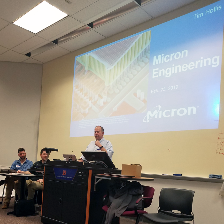 The image above is of Tim M. Hollis, Ph.D. (UT A ’03), senior member of the technical staff at Micron as he addresses attendees.