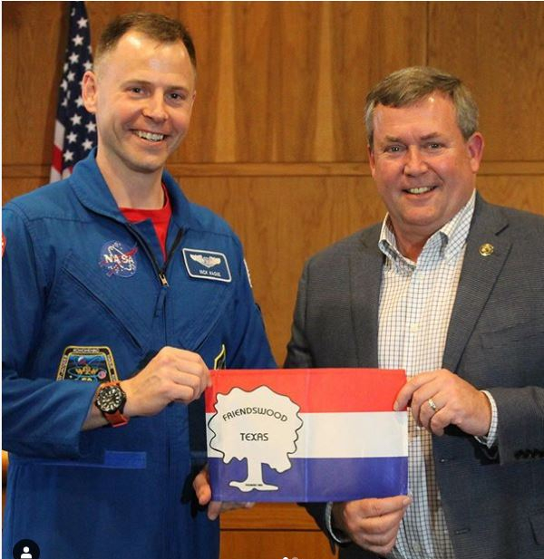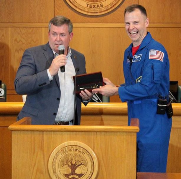 “Thanks to Mayor Mike for welcoming me back to Earth in true Friendswood fashionโ a flag, some cake, and a key to the city!”