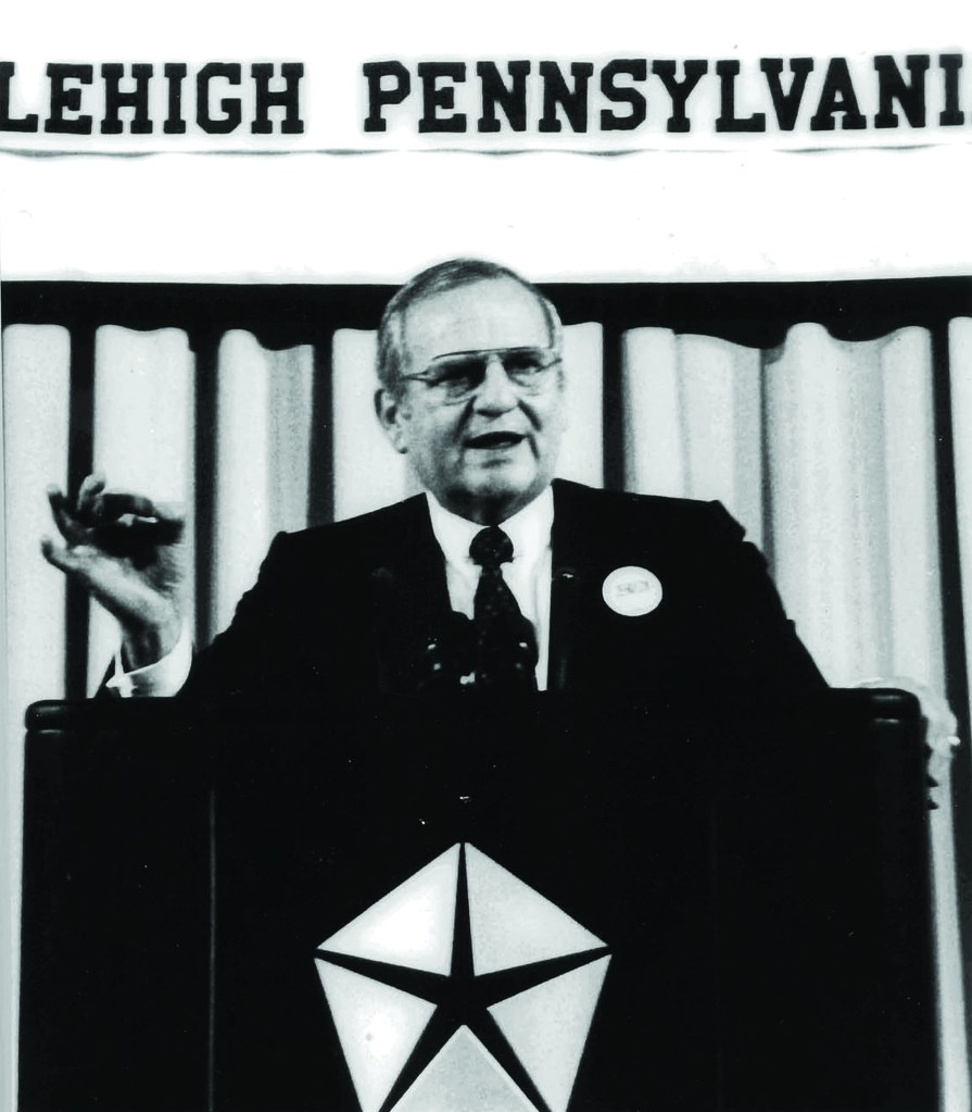 Iacocca was initiated into TBP on 12/6/44 at Lehigh University where he earned a degree in industrial engineering. He was a featured speaker at his alma mater for TBP’s 100th anniversary Convention in 1985. (pictured above) He spent time as president of both Ford Motor Company and Chrysler Corporation.