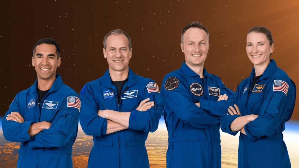 The official crew portrait of the SpaceX Crew-3 mission: (from left) Commander Raja Chari and pilot Thomas Mashburn, both NASA astronauts; mission specialist Matthias Maurer of the European Space Agency; mission specialist Kayla Barron of NASA. (Image credit: NASA)
