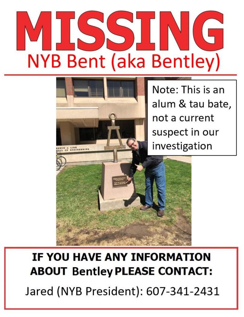Not every chapter has a physical Bent, so Paul utilizes the concept of virtual Bents, whether they are 3D models superimposed over where they would ideally be on campus or the location of the school of engineering. In the case of the New York Beta Chapter at Syracuse University, their Bent, “Bentley,” has been kidnapped by construction workers who have allegedly placed the monument in storage. Their solution was to create a “missing” poster for Bentley.