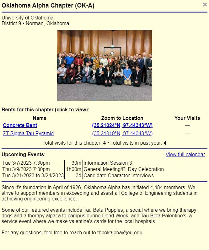 The Oklahoma Alpha Chapter provides an excellent example of how each chapter page can be utilized. It demonstrates how a chapter can configure its presence on the website to share information about them, the Bent and Sigma Tau Pyramid locations, and upcoming meetings! While Bent-O-Rama is primarily about the Bent monument, it is an ideal place to share history, photos of activities, and goals.