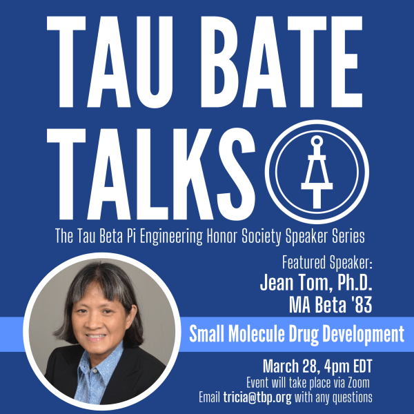 Tau Beta Pi is hosting a fascinating upcoming talk on March 28 about chemical engineering and innovation in small molecule drug development. Jean Tom, Ph.D., (MA Beta โ83) is the Executive Director of Development Engineering and Chemistry Process Development at Bristol Myers Squibb where she leads a group of chemical engineers focused on developing chemical... Continue Reading →